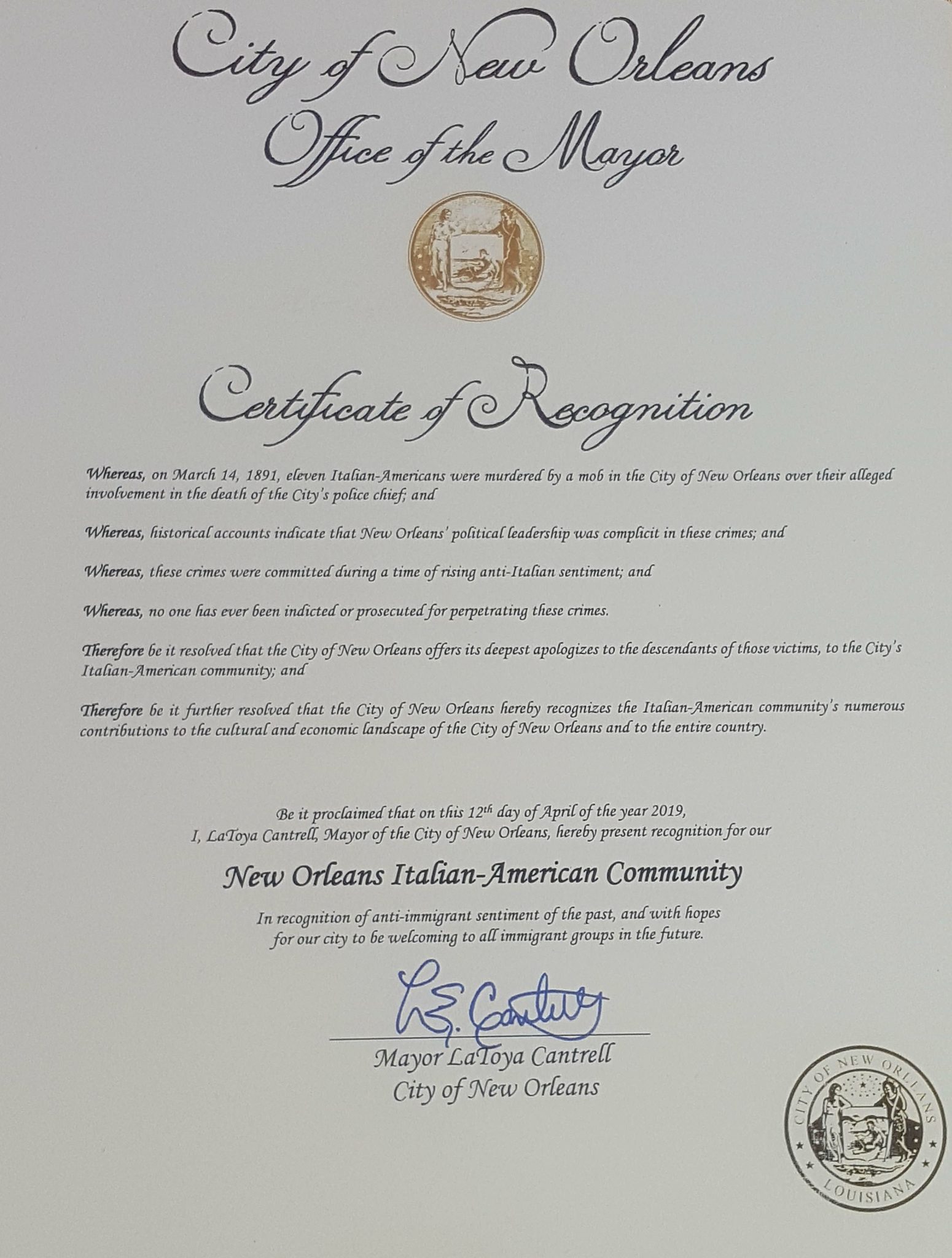 Successful in helping heal that wound, the Commission for Social Justice—the anti-bias arm of the Order Sons & Daughters of Italy—engaged the current New Orleans Mayor for an official Proclamation of Apology, which was offered at a recent April 12, 2019 ceremony in New Orleans.